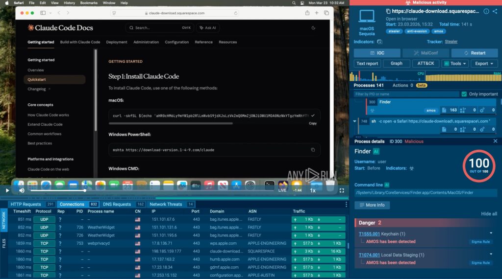The second campaign targets developers and AI tool users. Researchers found fake Claude Code documentation pages promoted through malicious Google ads. Those pages instruct users to paste terminal commands that fetch malware, including AMOS on macOS. Independent reporting from ANY.RUN and Bitdefender shows the fake pages closely mimicked the real install experience, which made the lure more convincing.