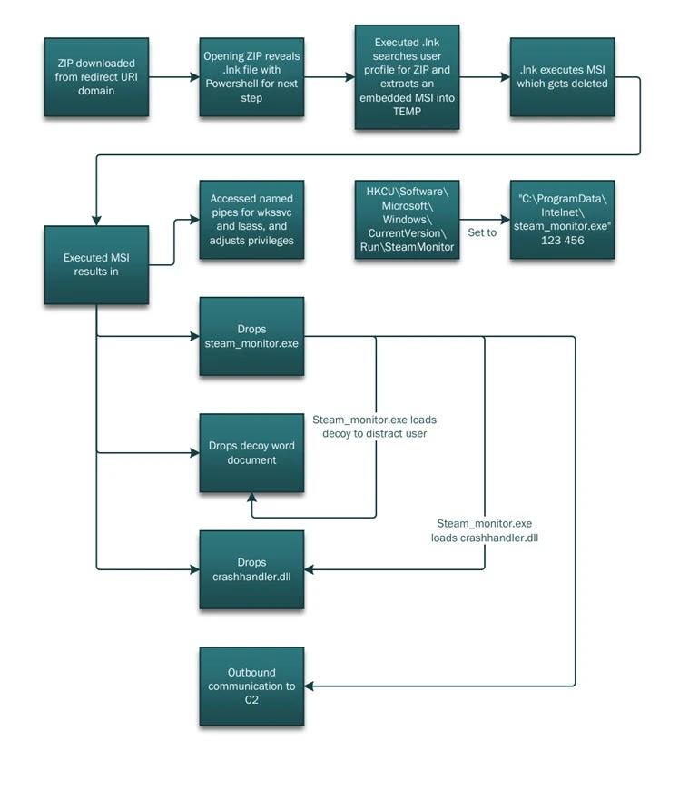 In some cases, the redirect led to attacker-in-the-middle phishing frameworks such as EvilProxy. In another campaign Microsoft described, the victim was sent to a /download/XXXX path where a ZIP file downloaded automatically. Microsoft says that payload chain could move from ZIP extraction into PowerShell execution, reconnaissance commands, and DLL side-loading.
