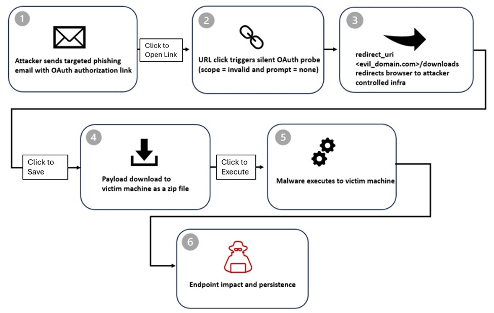 At the center of the attack is a crafted authorization URL sent to the Entra ID /common/oauth2/v2.0/authorize endpoint. Microsoft says attackers used prompt=none with an intentionally invalid scope so the request would fail on purpose. That failure triggers an OAuth error redirect to the redirect URI already registered by the attacker’s malicious application.