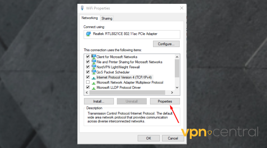 - Uncheck and re-check the box beside Internet Protocol Version 4 (TCIP/IPv4), then click Properties.
