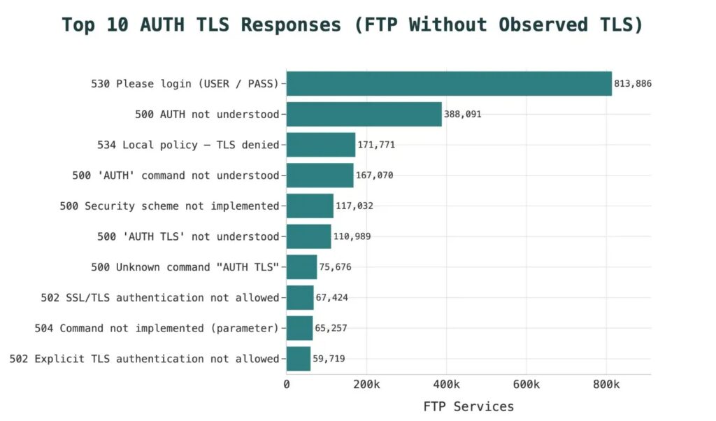 Encryption remains the biggest dividing line. Censys found that about 58.9% of observed FTP hosts completed a TLS handshake, while roughly 2.45 million hosts showed no observed evidence of TLS on any FTP service. Censys also notes that this does not prove every one of those systems transmits data in cleartext, but it does mark a large population with no observed evidence of encrypted FTP sessions.