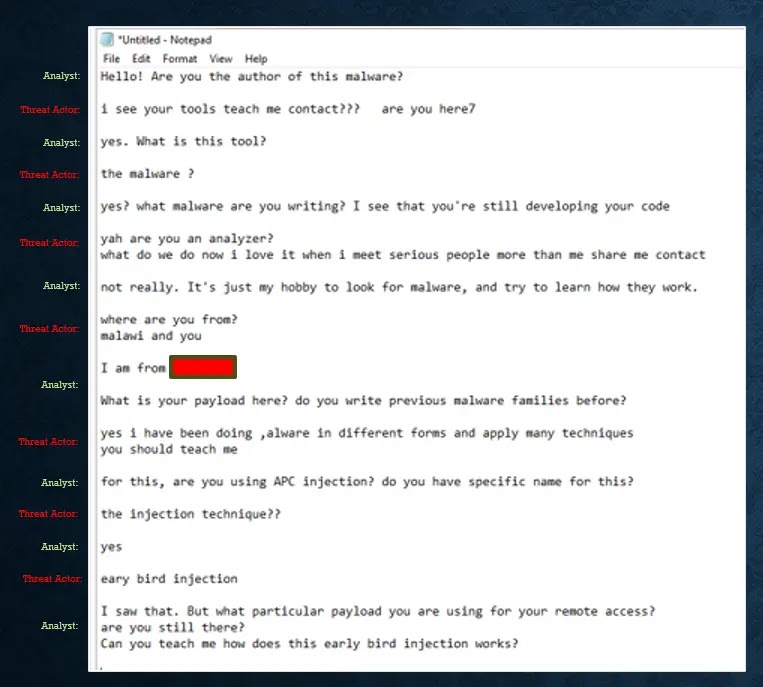 One of the most unusual parts of the case involved a live interaction during analysis. G DATA said a researcher left a message in Notepad on the compromised machine, and later received a response from the person believed to be operating the malware. According to the company, the reply confirmed active presence on the host and acknowledged the use of Early Bird APC injection in the loader.