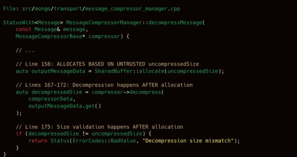 Cato CTRL ties the issue to MongoDB’s compressed message handling (OP_COMPRESSED) and says the server allocates memory based on an attacker-controlled “uncompressed size” field before it fully validates the decompressed result.