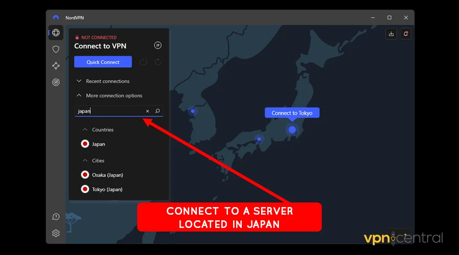 Alternatively, use the map on the app to locate server locations in Japan. Then, double-click on the blue dots to connect.