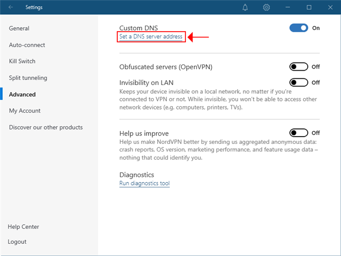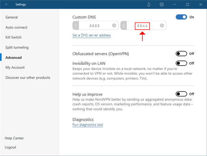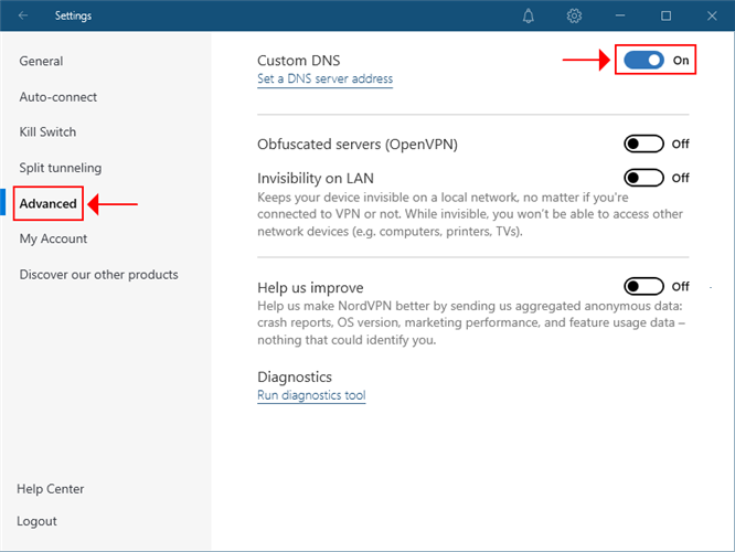 - Head over to the Advanced settings of NordVPN and turn on Custom DNS