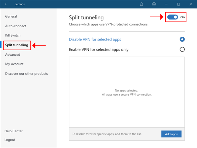 - Go to the Split tunneling section.