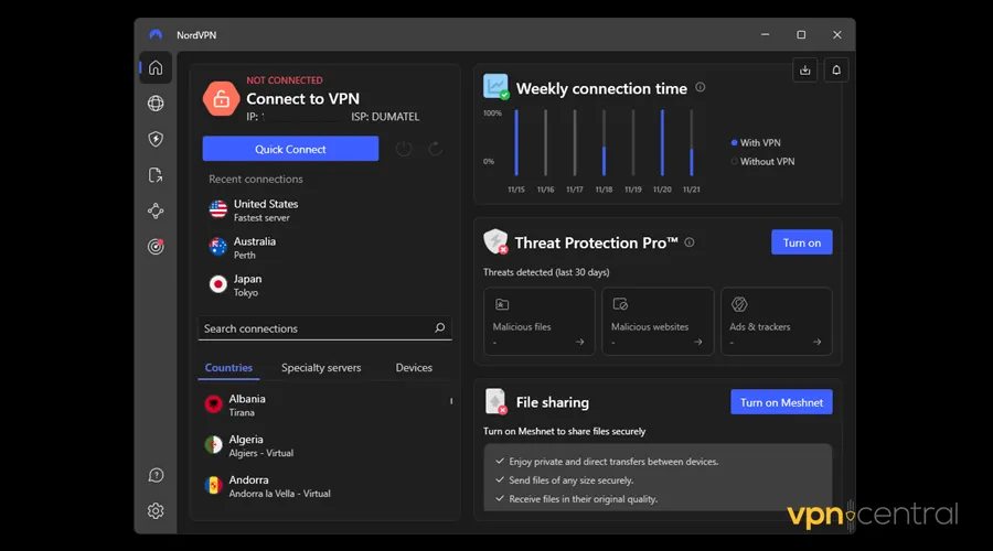 - Meshnet: Allows users to link devices, forming a secure private network. It facilitates secure file sharing, gaming, and remote access between the connected devices.