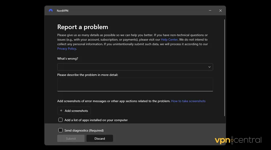 You can seek assistance via live chat, email, or report via the NordVPN app. The turnaround time is instantaneous, but technical issues may take longer to handle.