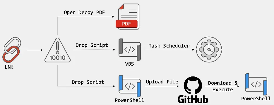 Execution chainLNK → PowerShell → VBScript persistence → GitHub-based C2
