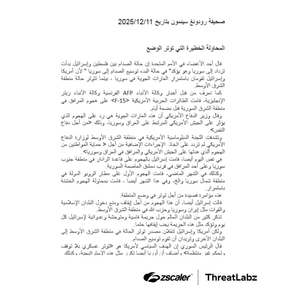 Arabic language decoy document leveraged in the Ruby Jumper campaign by APT37 (Source – Zscaler)