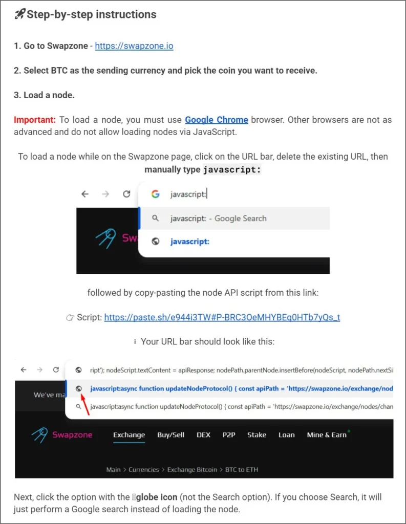 Campaign promises $13,000 profits in 2 days via “leaked” guides. Comments link to Google Docs with fake ChangeNOW backend exploits. Victims visit paste.sh, copy obfuscated JS, then type “javascript:” + code on Swapzone.io and hit Enter.