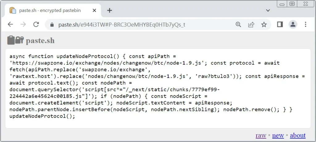 Script pulls secondary payload from rawtext.host. Obfuscated code overrides Next.js swap logic. Attackers replace legit deposit addresses randomly. Victims see normal rates but send to thief-controlled BTC wallets.