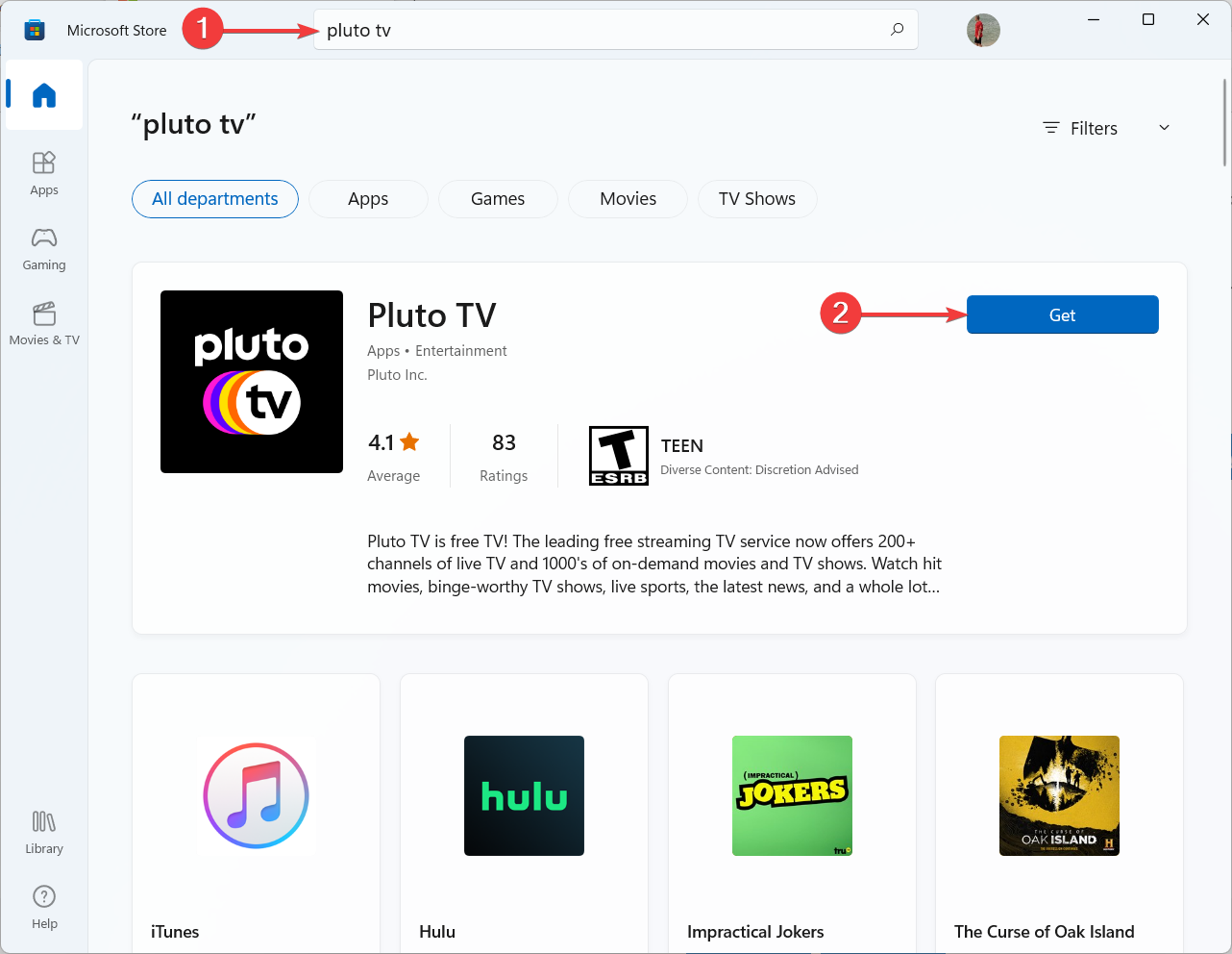 3. Type Pluto TV in the Microsoft Store search bar, then click Get.