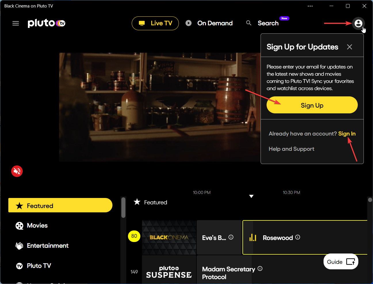 5. Start watching your favorite Pluto TV content live and on demand for free.