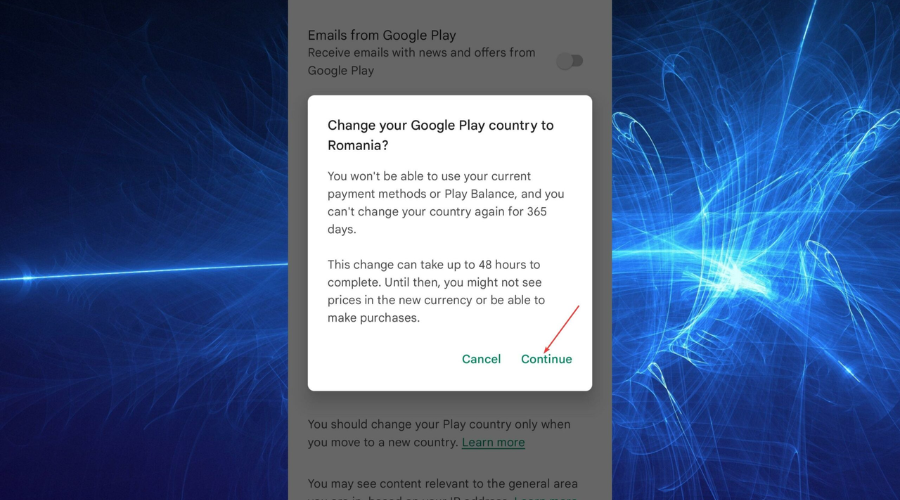 6. Tap on Continue to change your Google Play country. N.B. You can only change your country once a year. Also, it might take up to 48 hours for the changes to take effect.
