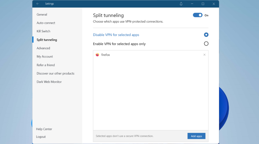 With Split Tunnel, you can create rules regarding how to use the VPN connection. For instance, you can elect to redirect only certain parts of your traffic via the VPN.