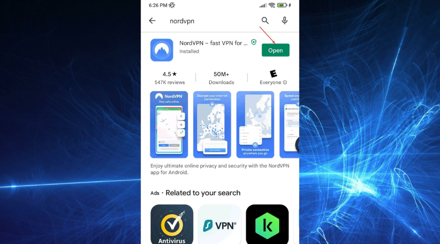 In this example, we set up NordVPN on an Android smartphone. This VPN service easily unblocks Pluto TV from anywhere and affords a very easy setup.