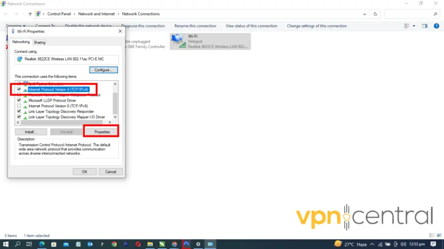 1. Return to the WiFi Properties panel and double-click on the Internet Protocol Version 4 option.