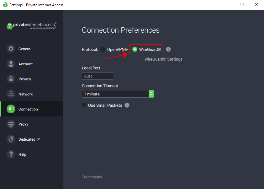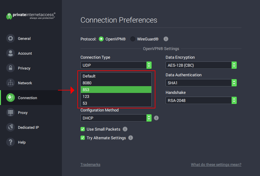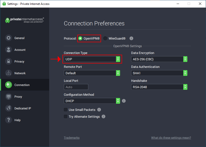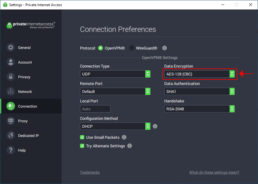 Private Internet Access has an entire menu dedicated to connection preferences, where you can change the VPN protocol, encryption mode, IP configuration method, and other properties.