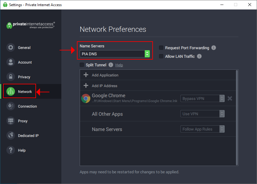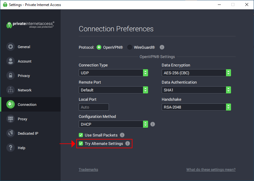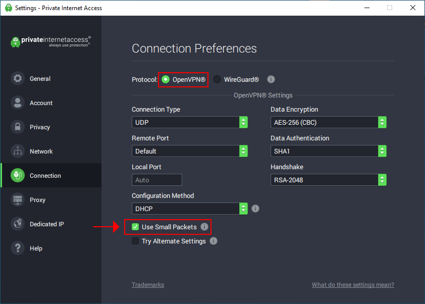 Furthermore, you can change connection preferences like VPN protocol, encryption mode, and small packets. You should also disable any faulty proxy servers you might have set up in PIA and try switching to custom DNS servers.