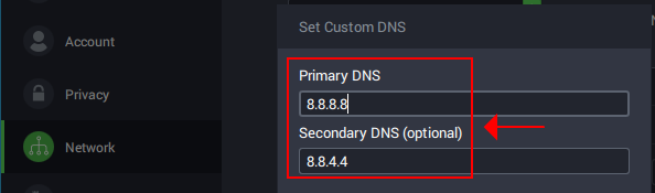 - Set Primary DNS to 8.8.8.8 and Secondary DNS to 8.8.4.4