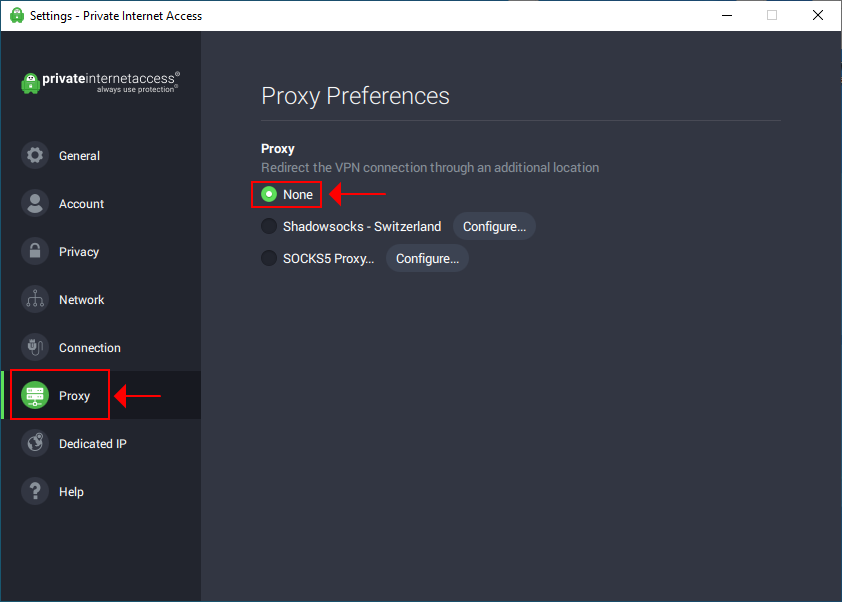 PIA has built-in support for Shadowsocks and SOCKS5 proxy servers. If you accidentally left any of them enabled with incorrect settings, it could be the reason why Private Internet Access is not connecting to the Internet. Here’s how to turn it off: