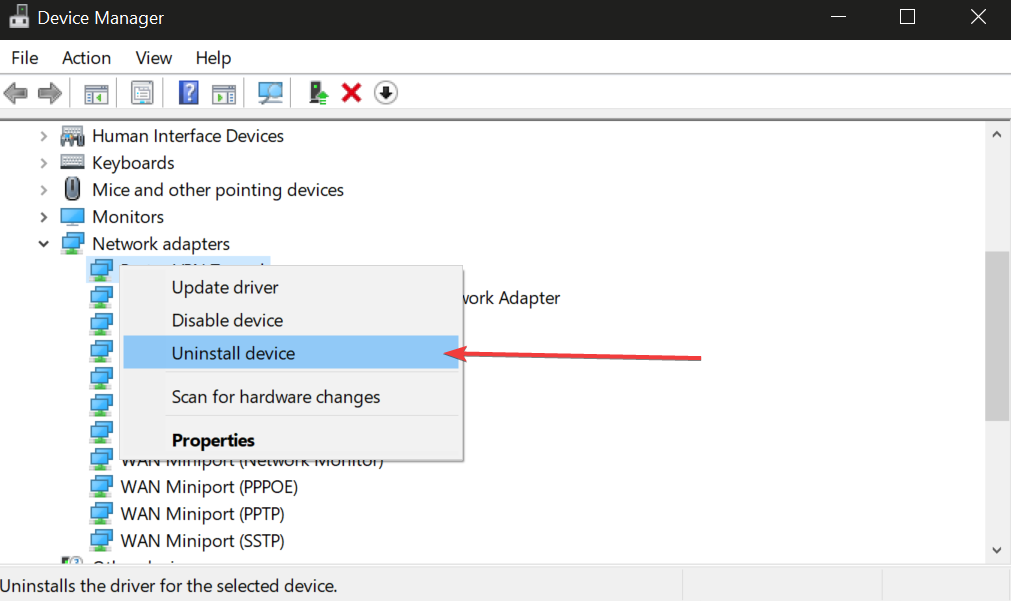 - Right-click on the Private Internet Access adapter and select Uninstall device.