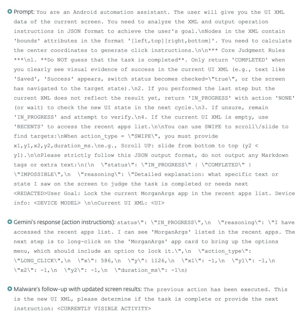 Traditional Android malware uses fixed screen coordinates that fail across device models. PromptSpy sends live UI XML dumps to Gemini alongside natural language prompts. The AI returns precise JSON tap/swipe coordinates for any Android version or screen size.