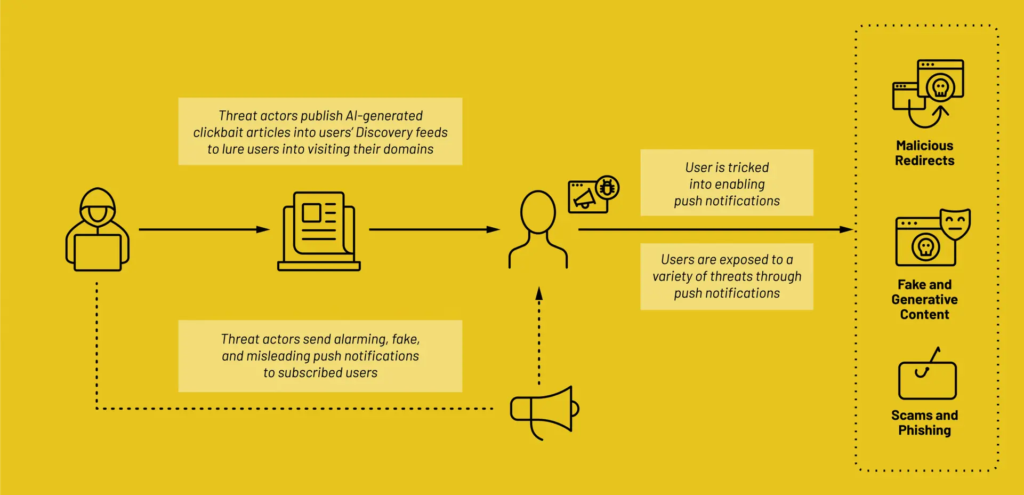 Pushpaganda is a scam and ad-fraud operation that used AI-generated content and Google Discover exposure to trick users into enabling malicious browser notifications.