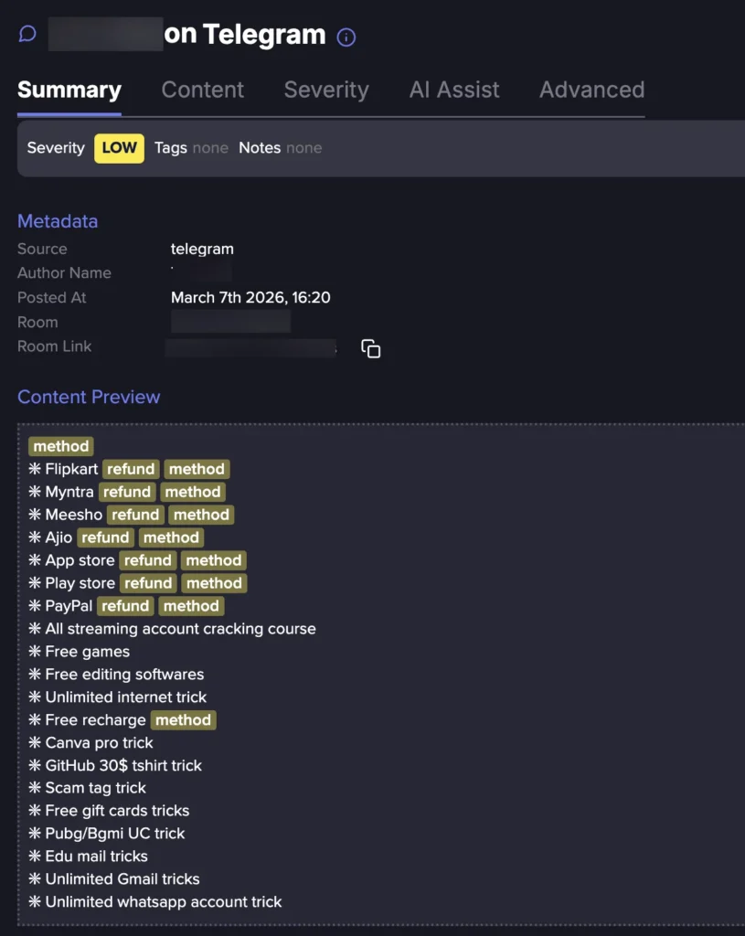 Flare said it started with a very broad search around “refund” and eventually narrowed the dataset using terms such as “method” and “tutorial.” From there, the company sampled 3,686 posts to understand how refund fraud gets marketed and operationalized. According to the report, only about 1,639 of those messages were unique, which suggests sellers frequently repost the same ads across multiple communities to widen their reach.