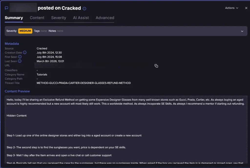 Refund fraud looks less technical than malware or credential theft, but the business impact can still be severe. The underground market makes entry easier for people who may not see themselves as cybercriminals in the traditional sense. A buyer can purchase a playbook, follow a script, and exploit a company’s returns or dispute workflow without ever writing code or compromising infrastructure.