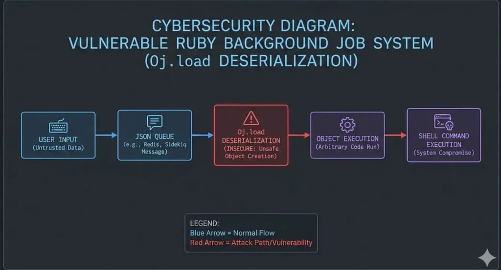 NullSecurityX disclosed deterministic RCE in Ruby background workers using Oj.load deserialization. Unauthenticated attackers craft JSON payloads triggering arbitrary shell commands via Node class. No gadget chains required; single line data = Oj.load(job.payload) enables full compromise.