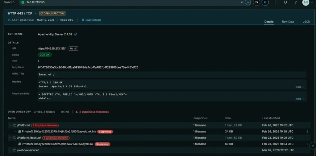According to the Censys ARC report, the infection starts with a malicious LNK shortcut disguised as a folder and named like a private key archive. When the victim opens it, hidden PowerShell code launches a staged in-memory loader, which delays exposure of the main infrastructure until later in the chain.