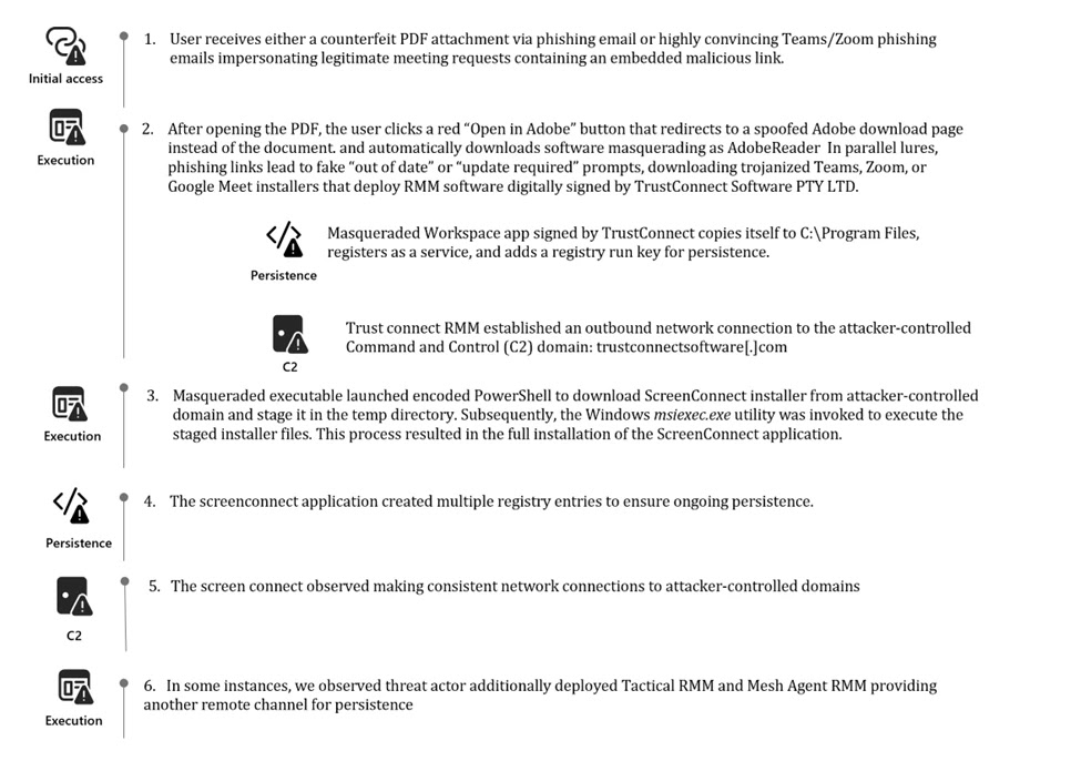 Attackers send phishing emails that look like meeting invites, invoices, or PDF notices. The links or attachments lead victims to fake download pages for apps like Teams, Zoom, or Adobe Reader, where signed malware gets installed.