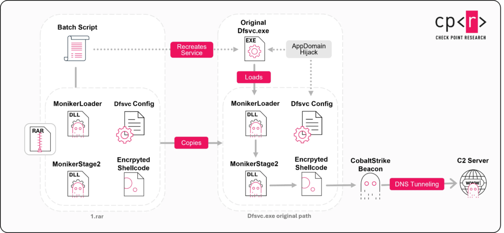 Check Point says one infection chain abused AppDomain hijacking, a known Windows execution-flow hijack technique. Another used a malicious service DLL registered under trusted-looking names. A third relied on phishing emails with malicious LNK attachments.