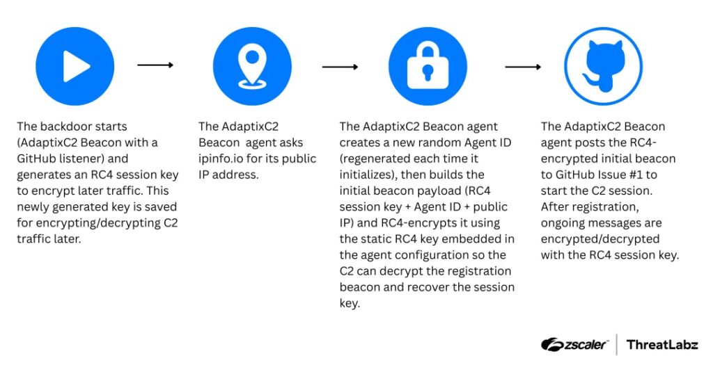 Zscaler says the beacon first fetches its external IP from ipinfo.io, then sends an encrypted initial beacon to GitHub Issue number 1. It later checks open issues for tasks, processes commands based on issue-title patterns, and posts encrypted results back to the repository as file content. Researchers also say the uploaded data was deleted within about 10 seconds, making forensic recovery much harder.