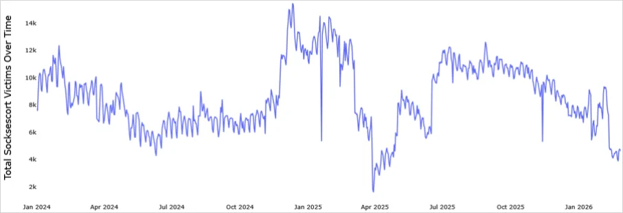 Lumen’s Black Lotus Labs tied the network to AVRecon, a Linux malware strain first detailed in 2023. The researchers said SocksEscort had maintained an average of about 20,000 infected devices each week for the last few years, and that they observed 280,000 distinct victim IP addresses since early 2025.