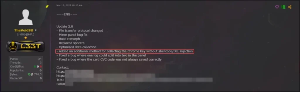 Researchers traced the technique to VoidStealer version 2.0, which Gen says introduced the debugger-based ABE bypass on March 13, 2026. The malware has been marketed as a malware-as-a-service offering since mid-December 2025 and has seen rapid version updates since then.