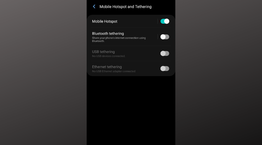 - Launch your phone’s Hotspot and tethering settings and create a mobile hotspot connection.