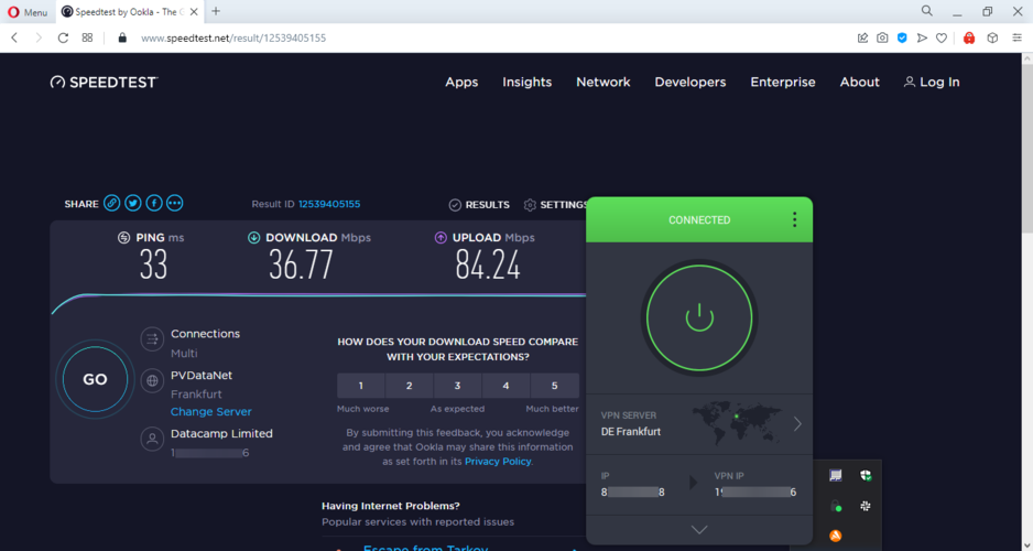 | Speedtest.net | Extension | Frankfurt | 58.28 | 92.37 | 38 | N/A |