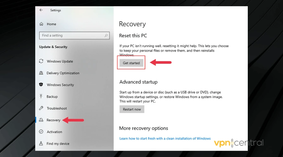 - Then click on Get Started below the Reset PC menu.