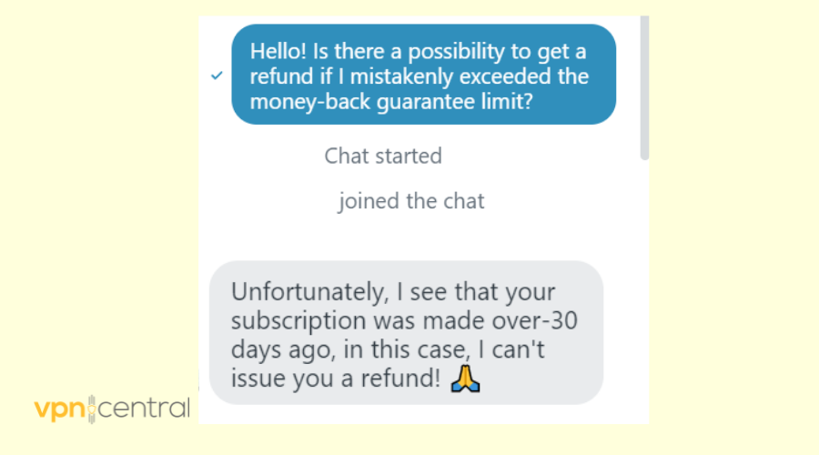 Most VPN services have 24/7 live chat support on their official website. You can talk to an agent about your issue. They should know exactly how to apply their policy to your specific situation.
