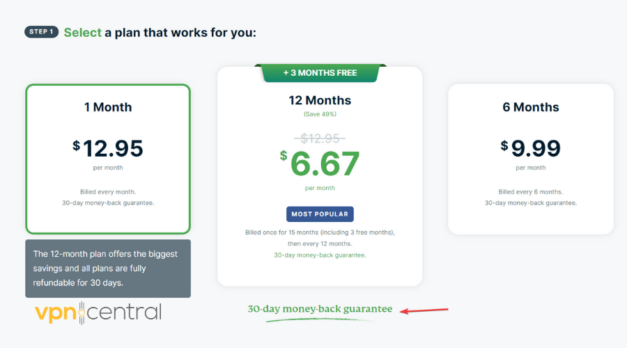You can see that in this case the plans are covered under a 30-day money-back guarantee, so you’ll have to pay beforehand.