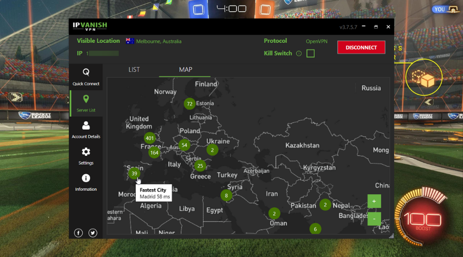 Let me give you an example: if you’re in England and play on servers abroad, a VPN allows you to select server locations, and distribute traffic across multiple nodes, reducing ping and packet loss in Rocket League. It can also help with ISP throttling and Rocket League DDoS attacks.