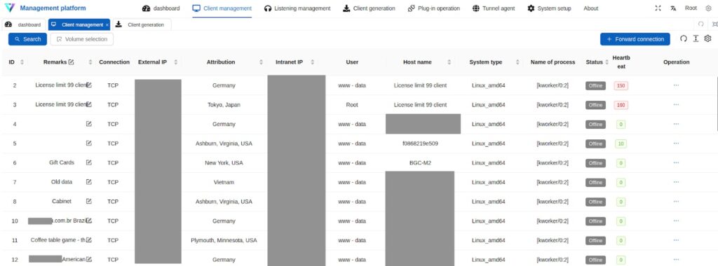 Censys mapping also revealed exposed Vshell panels on the open web, some of which showed hundreds of live agents connected at the same time. One captured panel displayed 286 active clients, each capable of acting as a relay for traffic tunneling and internal‑network pivoting. [Censys blog]