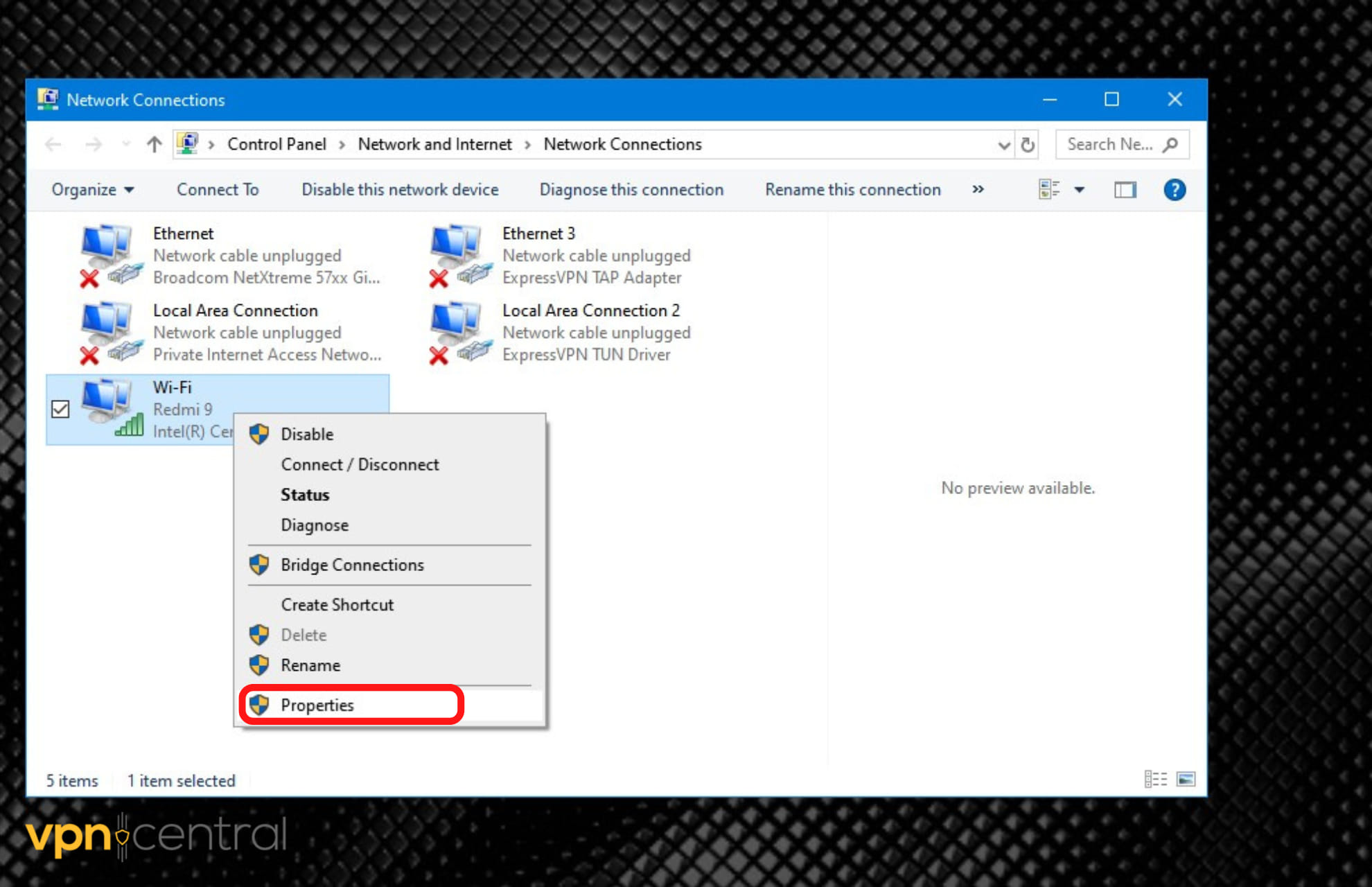 - Right-click on your currently active internet connection after you have selected it. You should then select the Properties option from the context menu.