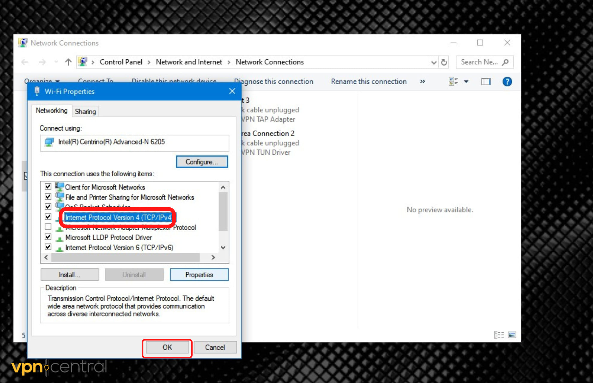 - Afterward, in the Properties dialog window that has just opened, select the Internet Protocol Version 4 (TCP/IPv4) option, and then click the Properties button.