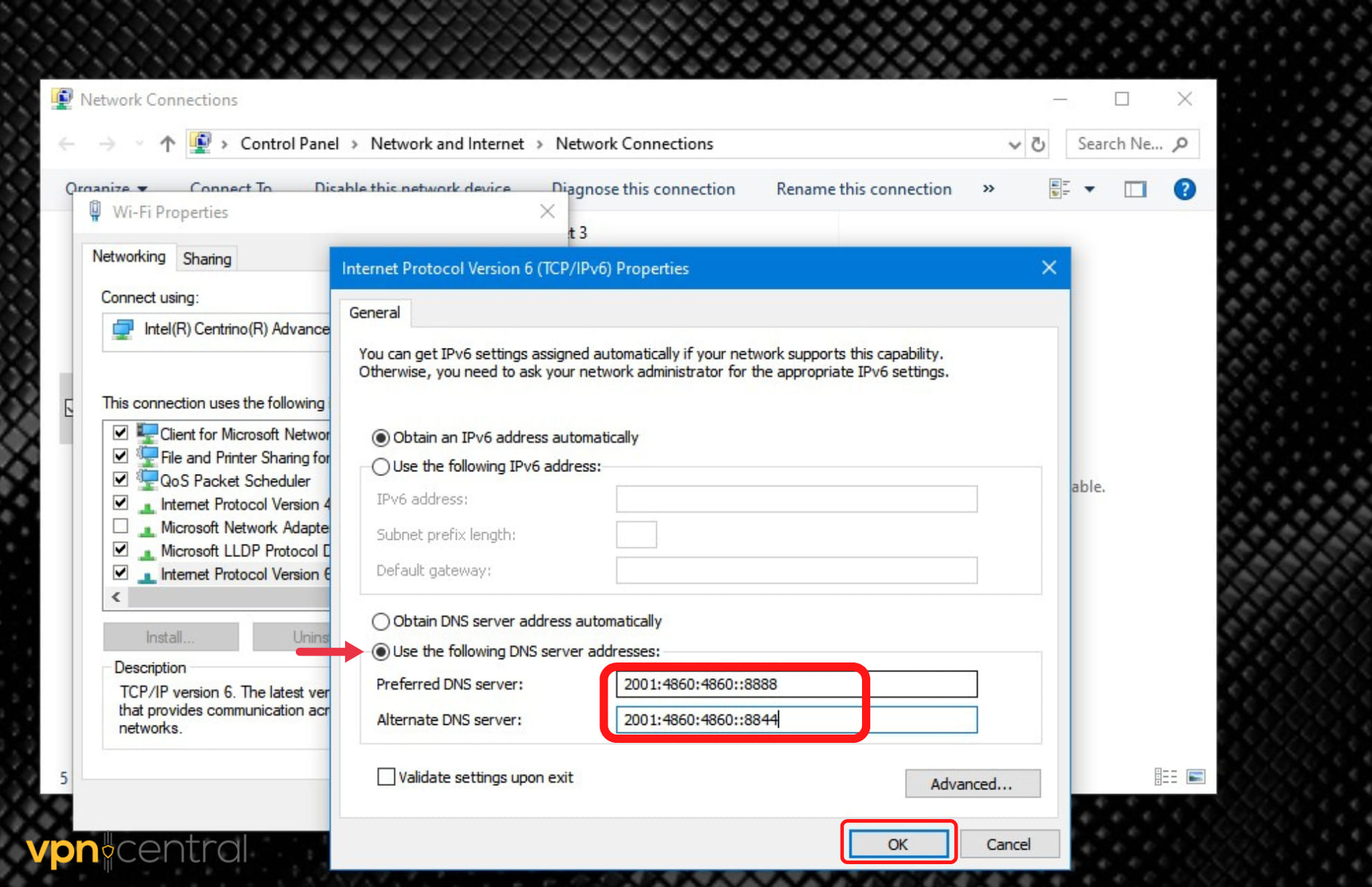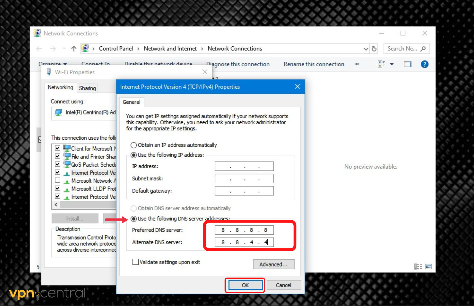 - After that, select the option to Use the following DNS server addresses, and then enter the following addresses into the fields that correspond to them: